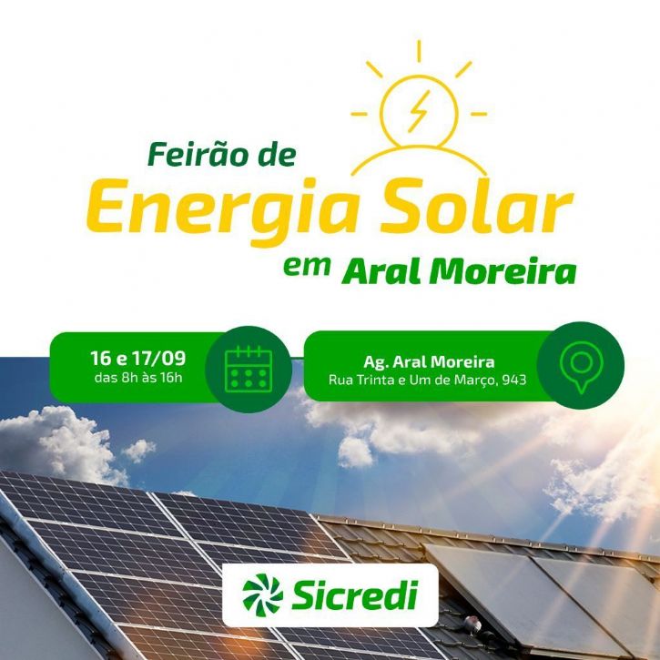 — 3741Aral Moreira (MS) – Entre os dias 16 e 17 de setembro, quinta e sexta-feira, a Cooperativa Sicredi de Aral Moreira realiza o “Feirão de Energia Solar”, com a participação de empresa do segmento.