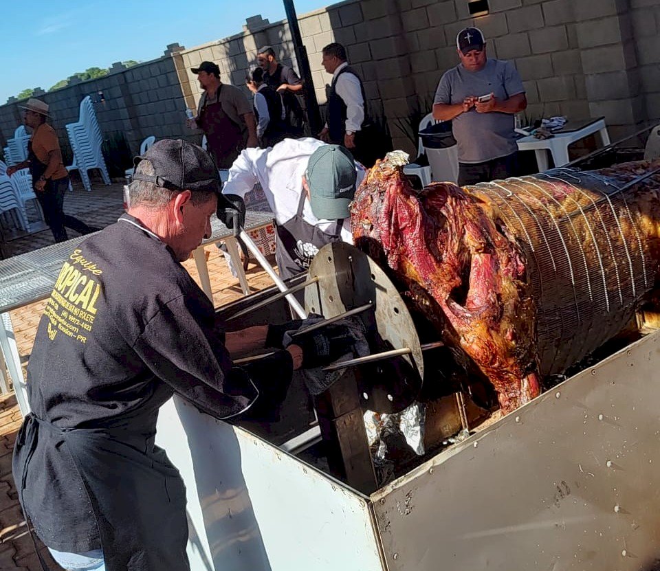O grande destaque da festa foi o tradicional boi no rolete, assado com maestria por uma equipe especializada vinda diretamente de Marechal Cândido Rondon — a renomada Equipe Tropical, conhecida por sua expertise em preparar eventos dessa magnitude. Ao todo, dois bois inteiros foram assados, garantindo sabor e fartura aos participantes.