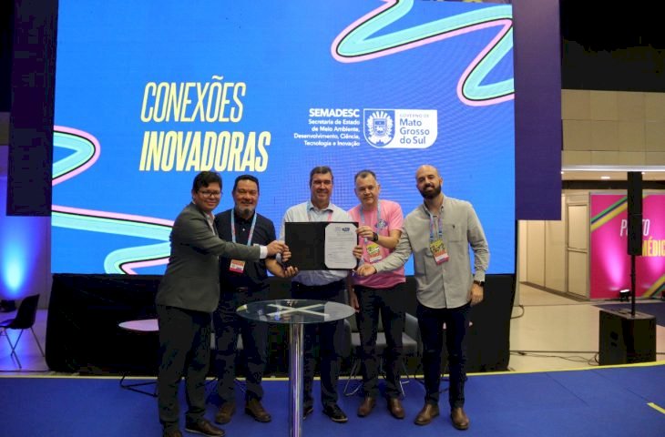 Participaram da assinatura o governador Eduardo Riedel, o secretário-adjunto da Semadesc, Artur Falcette, o secretário-executivo de Ciência e Tecnologia, Ricardo Senna, o superintendente da Caixa em MS, Augusto Vilhalba, e o representante do Hub Teia, líder de negócios da Caixa, Mike Soares.