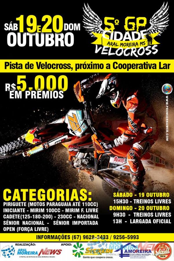 Em sua 5ª edição, o GP de Velocross de Aral Moreira promovido pelo site Aral Moreira News acontece na pista de velocross montada na Chácara Santo Antônio, próximo a Cooperativa Lar. A competição é considerada pelos pilotos como uma das melhores provas da modalidade no Estado, tanto pela organização como pelo nível técnico.