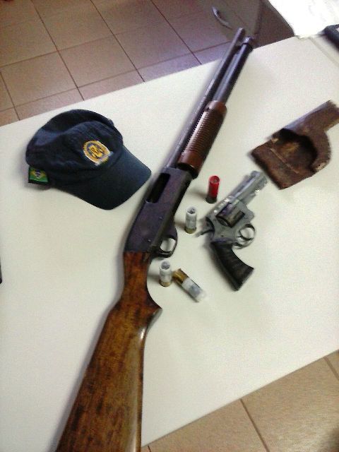 Em averiguação no interior da casa, sendo acompanhado pelo casal, os policiais encontraram sobre o guarda-roupa em um dos quartos da residência, um revólver e uma espingarda com quatro munições intactas.