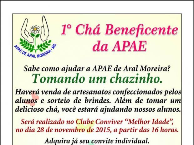 — 1836Aral Moreira (MS) – Será realizado neste sábado, 28 de novembro, a 1ª edição do Chá Beneficente da APAE (Associação de Pais e Amigos dos Excepcionais), em Aral Moreira.