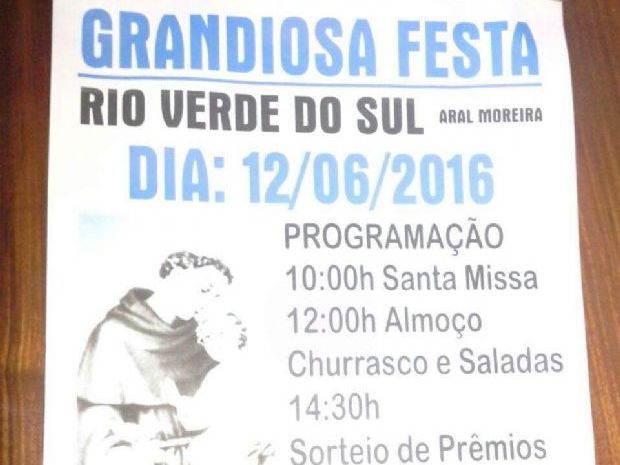 — 1358Aral Moreira (MS) – Acontece no domingo, dia 12 de junho, mais uma edição da tradicional festa de Santo Antônio, no distrito do Rio Verde do Sul, em Aral Moreira