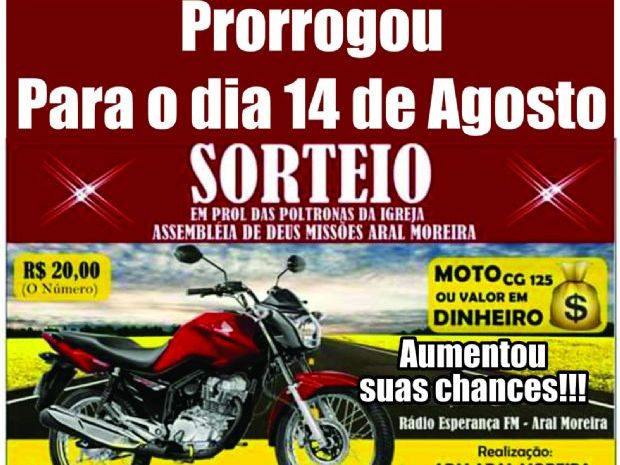 — 2413Aral Moreira (MS) – Foi prorrogado para o próximo dia 14 de agosto, um domingo, o sorteio de uma motocicleta Honda CG 125 KS zero quilômetro, promoção da Igreja Assembleia de Deus Missões, de Aral Moreira.