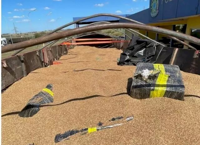 Ao se aproximarem do semirreboque, os policiais sentiram forte cheiro de maconha. Assim que abriram a lona e reviraram o trigo, encontraram os primeiros fardos de droga.