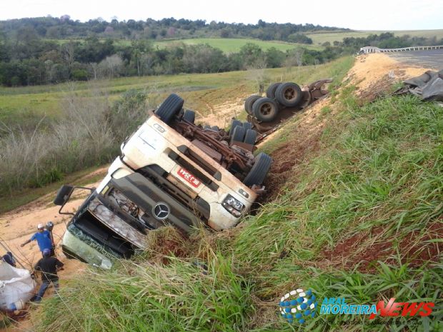 Segundo as informações, a carreta teria carregado em um armazém na região de Aral Moreira e seguia para Santa Catarina. Ninguém se feriu.
