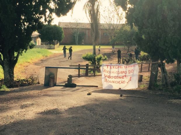 Depois de invadirem a propriedade e expulsar os moradores, os indígenas estenderam uma faixa reclamando o sumiço de um suposto “cacique” supostamente morto durante a invasão de outra propriedade rural da região tempos atrás.